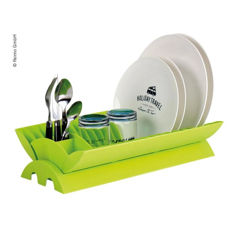 Egouttoir en polypropylène de couleur vert clair, il saura trouver sa place au sein de la cuisine de votre camping-car. Dispose de clayettes pour disposer vos assiettes, d’un compartiment central pour les verres et de deux bacs pour y déposer les couverts. Les deux clayettes peuvent se replier vers l’intérieur pour un gain de place et ainsi se ranger facilement.
