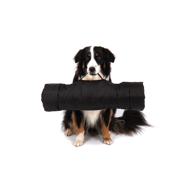 Le tapis pour chien est présenté en gris et en noir. Une fois enroulé, il ne prend que très peu de place et ses lanières velcro pourront le maintenir enroulé.