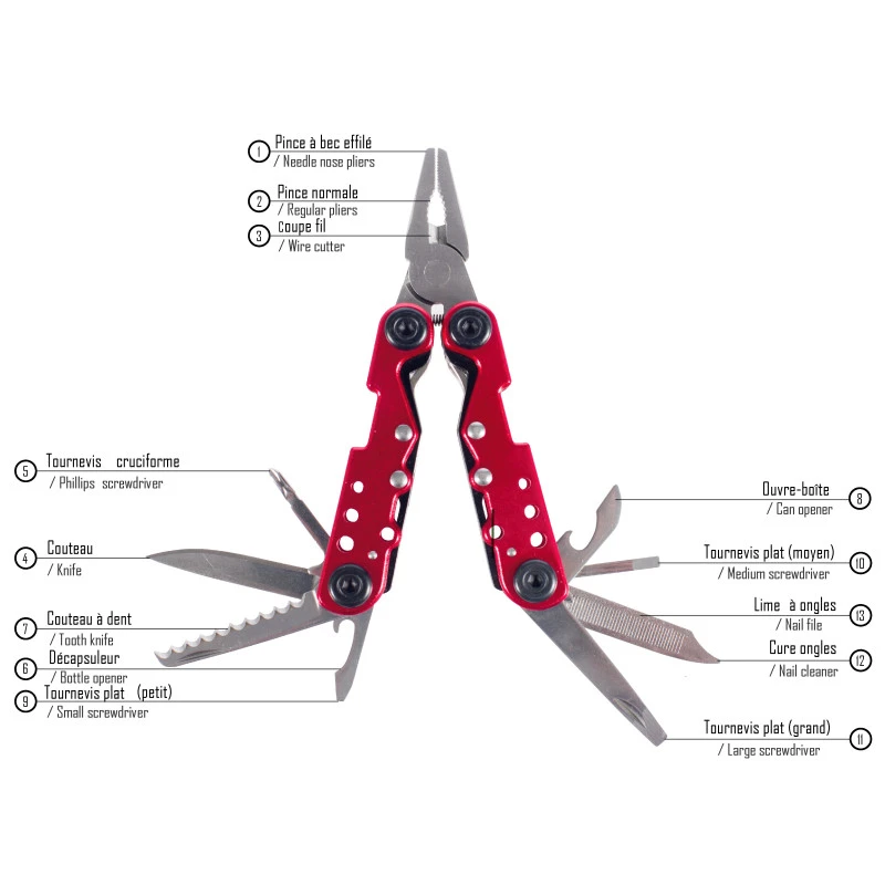 Pince, couteau multifonctions de CAO OUTDOOR « PM-Outils » en acier inoxydable idéal pour le camping, randonnée ou en bateau. Coloris rouge.