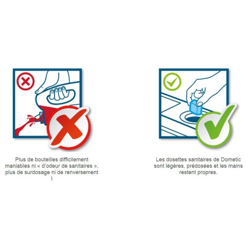 Enfin la fin des liquides pour WC chimiques traditionnels : compliqués à stocker, fortement odorants et difficiles à doser. Avec une dosette GreenCare Tabs de DOMETIC vous avez la dose nécessaire pour un réservoir à matière de 20 L !