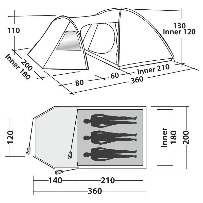 - Grande chambre : Avec une surface au sol de 210 x 180 cm, vous pouvez disposer à l’intérieur de la tente Eclips 300 un confortable et épais matelas gonflable.