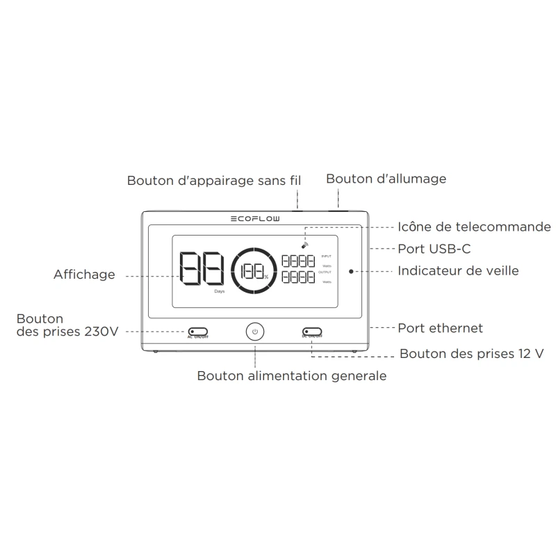 La télécommande affichera la quantité d’énergie utilisée, le temps de batterie restant (en jours & heures) ainsi que toutes les données transmises par la Delta Pro. La télécommande affichera donc le même contenu que l’écran de la Delta Pro. Grâce aux boutons sur la façade, vous pourrez allumer ou éteindre les prises USB ou 230V mais également l’unité entière.