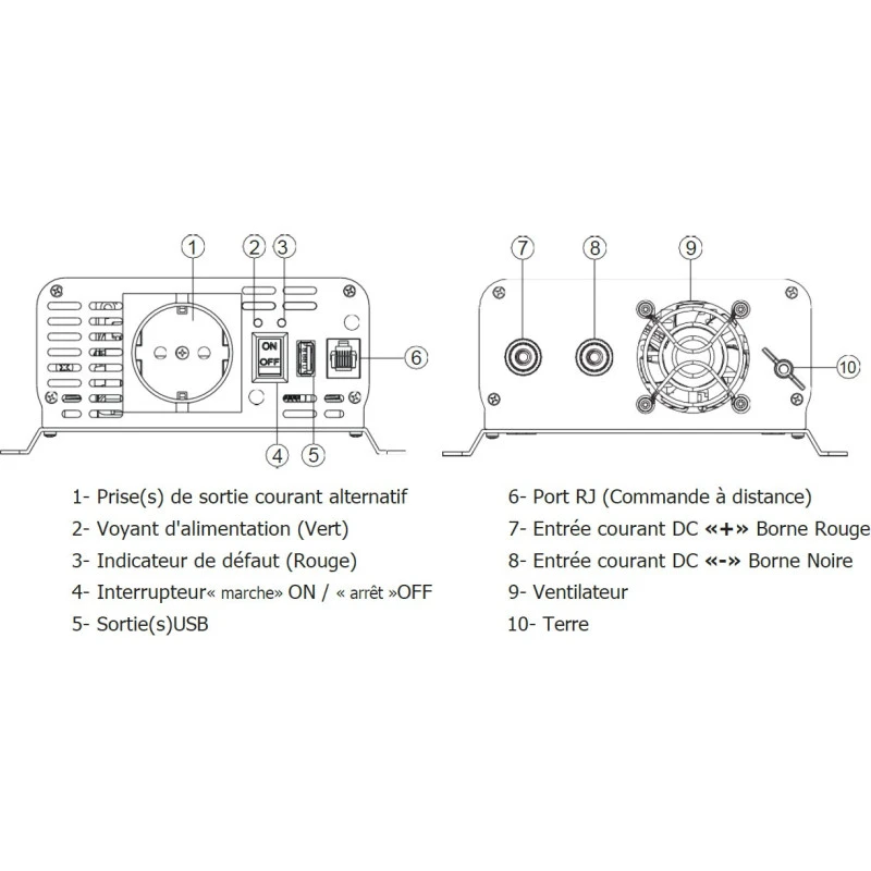 - Pour installation fixe du convertisseur en bateau et camping-car prévoir fusible entrée 40A