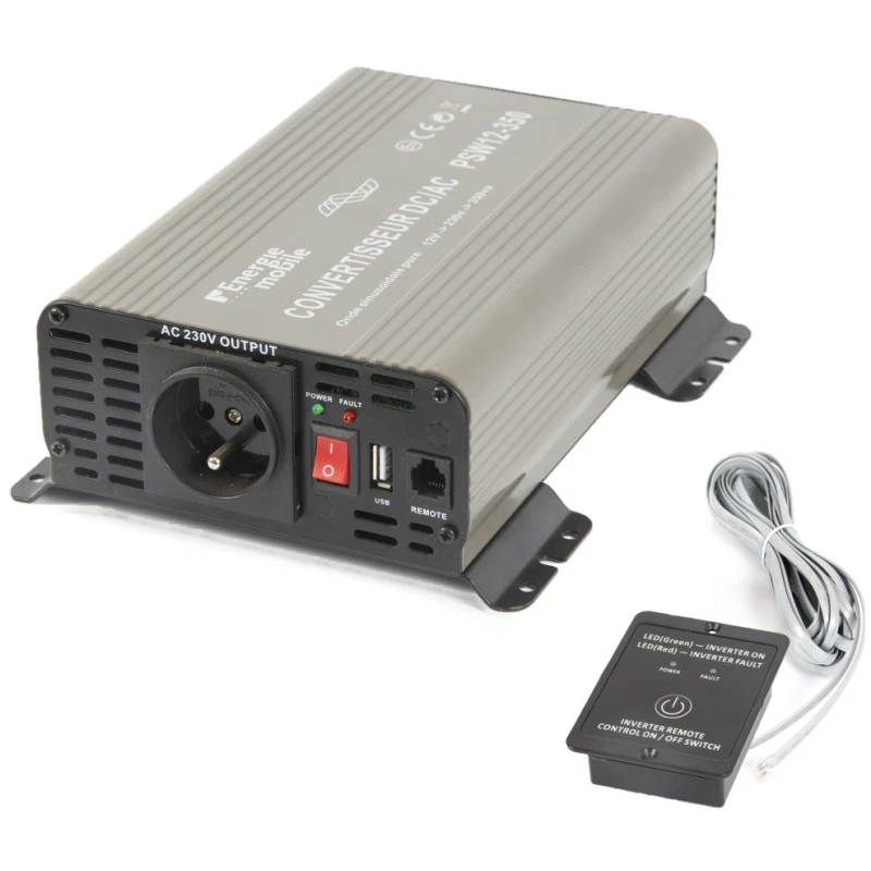 ENERGIE MOBILE entreprise française spécialiser dans le solaire et conversion d’énergie propose ici sont convertisseur pur sinus pour le grand publique. Destiné à l’application de loisir ce convertisseur d’une puissance de 350W permettra d’alimenter tout type d’appareil y compris les plus sensibles grâce a sont énergie restituée en 220/230V à ondes parfaite similaire au courant domestique (Pur Sinusoïdal Wave).