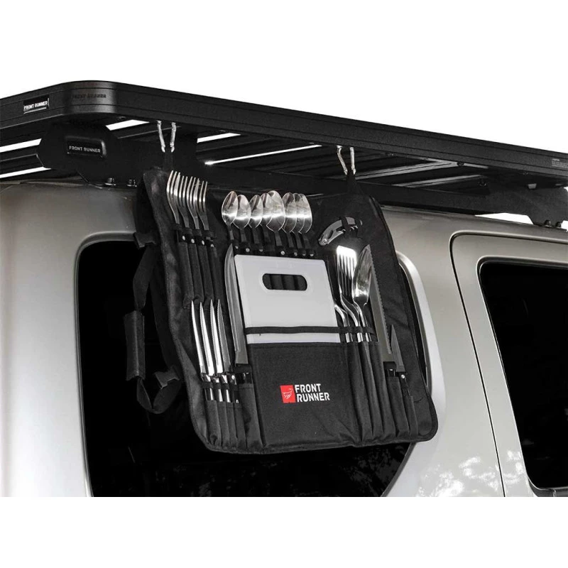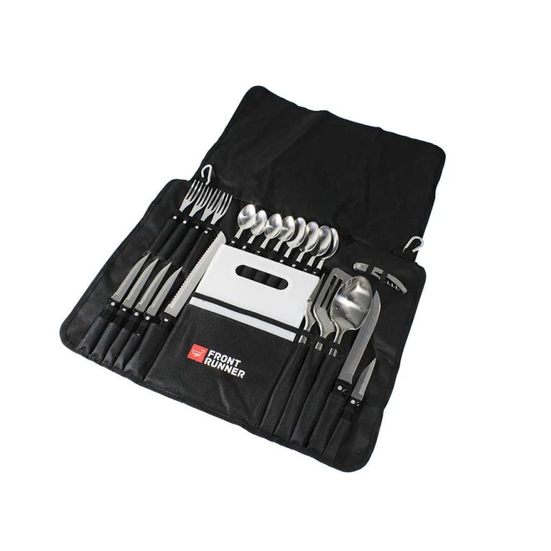 Set de cuisine complet de haute qualité avec un niveau de finition supérieure aux couverts de camping du marché : le set de chez FRONT RUNNER est rangé dans un étui en tissu doté de mousquetons et de poignées pour les disposer où vous le souhaitez à bord de votre van ou près de votre barbecue.